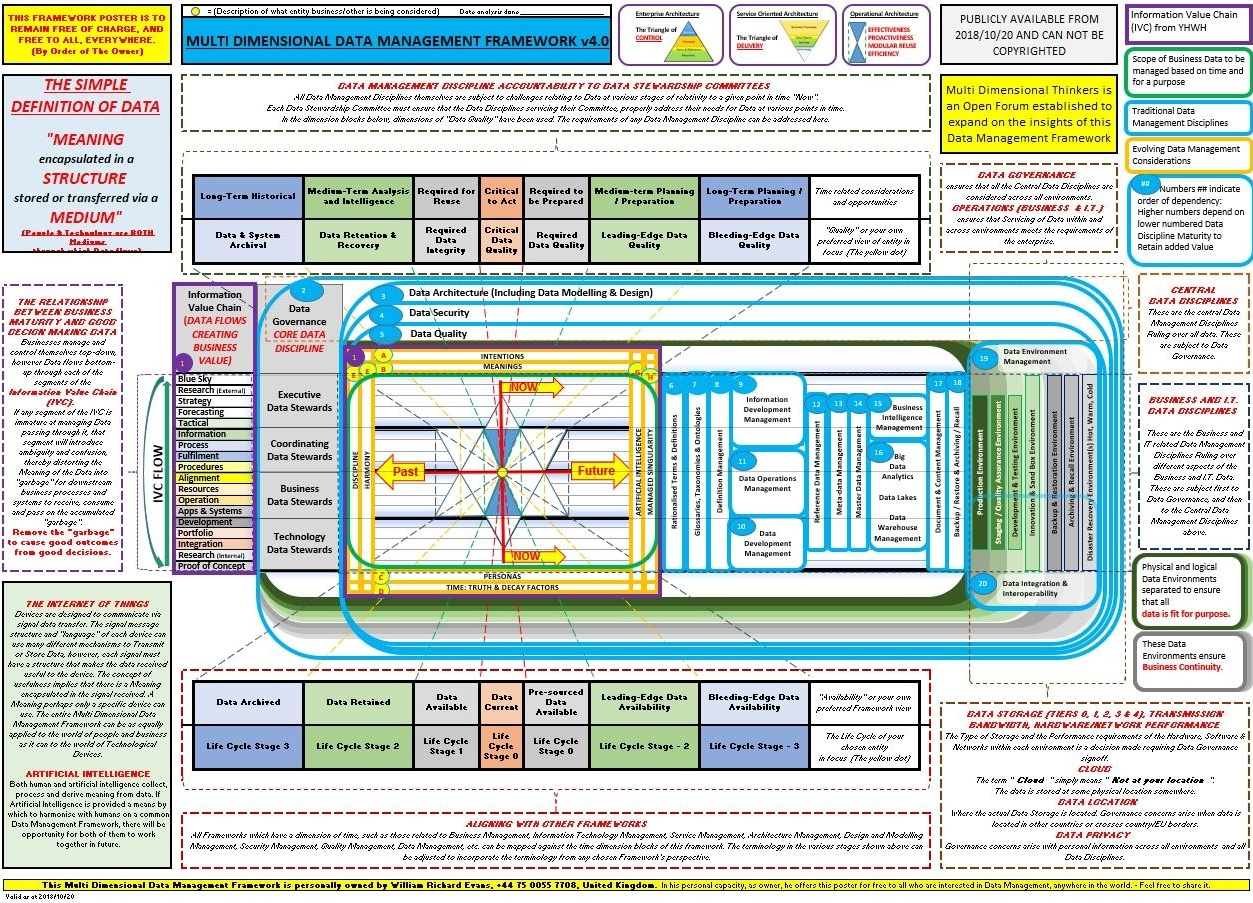 The Multi Dimensional Data Management Framework V4.0 is personally owned by William Richard Evans, In his personal capacity, as owner, he offers this poster for free to all who are interested in Data Management, anywhere in the world. - Feel free to share it.