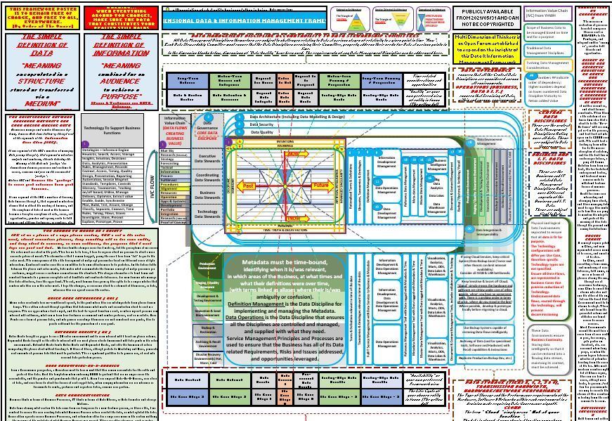 Disclaimer: William makes no claim that using this framework will solve all your problems, and also advises that unless you are trained in its use, that you should use it at face value and in conjunction with all other frameworks, especially the DAMA DMBOK and DMBOK2 to which this framework is aligned. This Framework is a thinking tool to understand cause and effect and assists in maintaining many of the various concepts and dimensions of Data Management as a visibly represented "One-Pager". It is useful when discussing anything related to Business, IT, and especially Data.